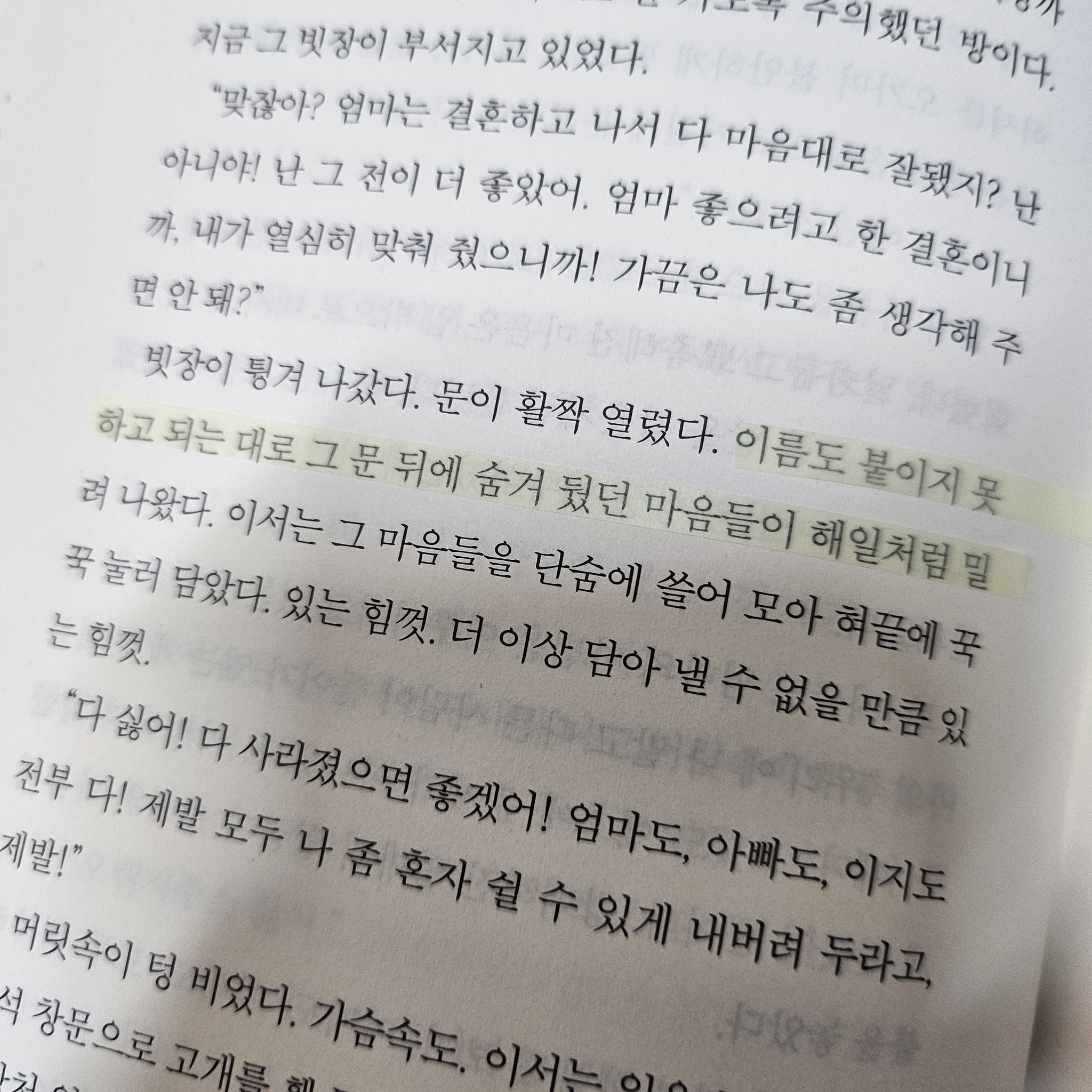 좋았던 부분은 필사해 두기. 꾹꾹 눌러놓고 있던 고등학생의 감정이 확 터지는 부분이 좋았다. 고등학생 같아서. 조금만 시간이 지나고 차분히 생각해 보면 절대로 하지 못할 말도, 진심이 아닌 말도 확 터져서 나오는 부분이 정말 그 나이의 아이 같아서. 그 시절을 보낸 사람이라면 많이 공감하지 않을까.