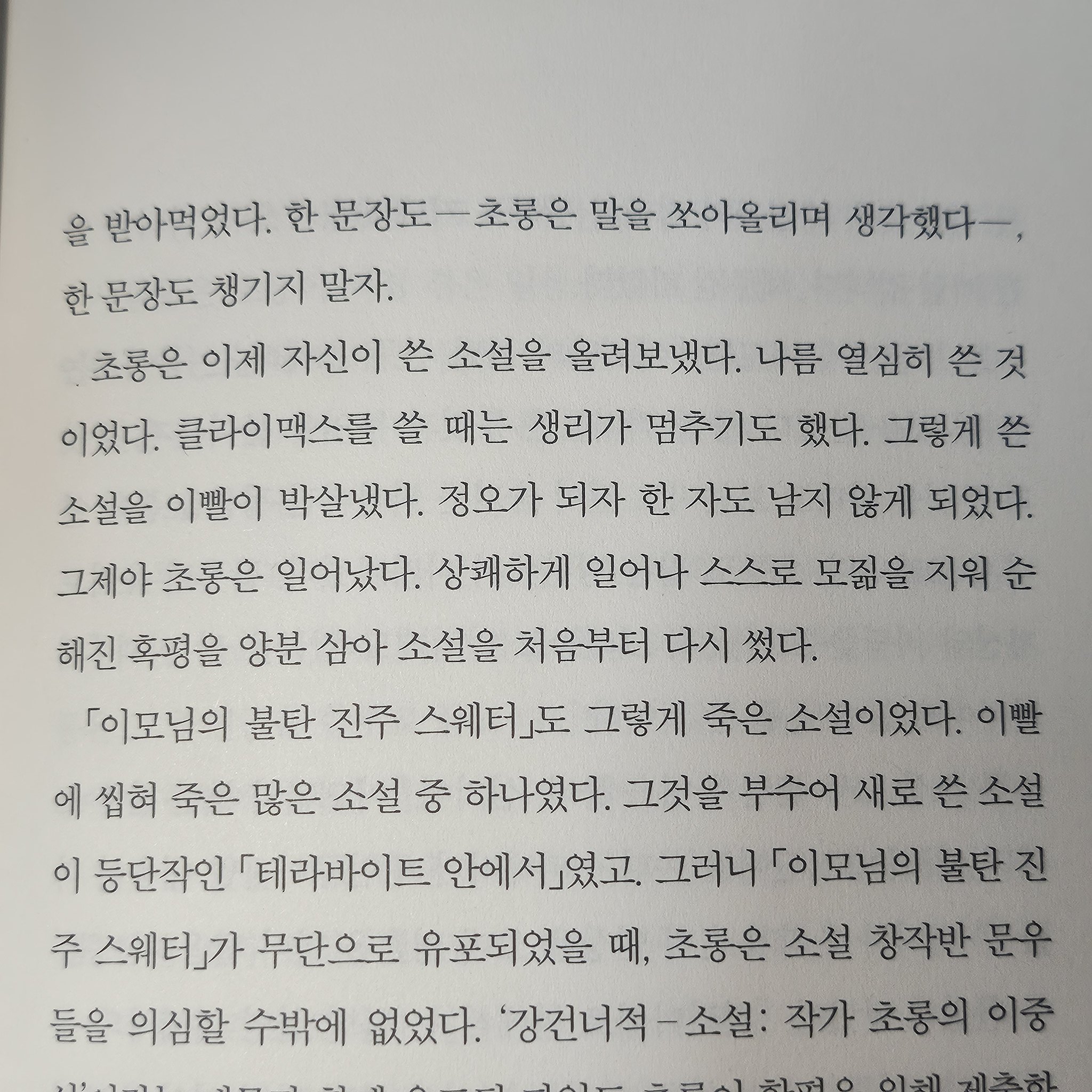 사실 편하게 읽었다고 할 수는 없는데, 그거랑 별개로 이런저런 생각을 많이 하게 하는 소설이었다. 글 쓰는 사람들이 많이 등장해서 그런가 괜히 더 곱씹게 되는 부분들도 있고. 언젠가 기억이 희미해질 때면 또 다시 읽어봐도 좋을 것 같다.